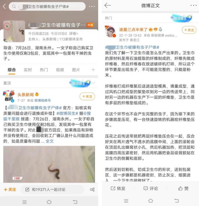 一位網(wǎng)友購(gòu)買衛(wèi)生巾以后發(fā)現(xiàn)蟲(chóng)子,于是拍攝了照片和視頻上傳微博。這一事件經(jīng)過(guò)其他網(wǎng)友和媒體的轉(zhuǎn)發(fā)以后,迅速?zèng)_上熱搜,商家立刻回應(yīng)。