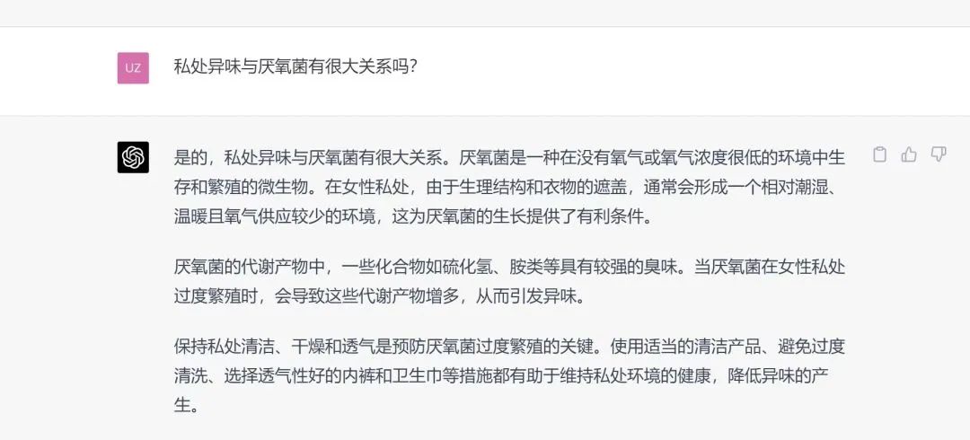 我們最早發(fā)現(xiàn)婦科異樣的,無非是瘙癢、異味等不適感。而厭氧菌又和這些癥狀有什么關系呢?我們提問了最近特別火的ChatGPT,它給出了這樣的答案:
