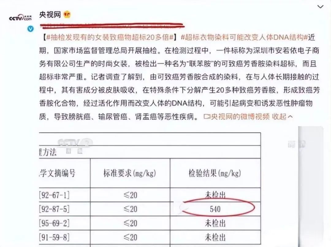 央視網(wǎng)曾報道,國家市場監(jiān)督管理總局抽檢過程中發(fā)現(xiàn),一種名為“聯(lián)苯胺”的可致癌芳香胺染料,出現(xiàn)在時尚女裝中,并且大量超標(biāo)。而這種有害成分被人體吸收后,經(jīng)過活化作用,甚至可以改變?nèi)梭w的DNA結(jié)構(gòu)!
