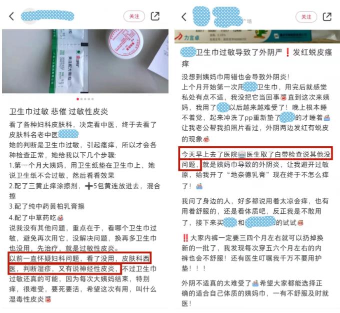 在社交媒體平臺(tái)上,許多患者分享自己的就診經(jīng)歷。在遇到此類(lèi)問(wèn)題時(shí),大部分人第一反應(yīng)就是得了婦科疾病。但是通過(guò)很多的檢查和診斷都不得法,究其原因,才發(fā)現(xiàn)原來(lái)是“衛(wèi)生巾”惹的禍。