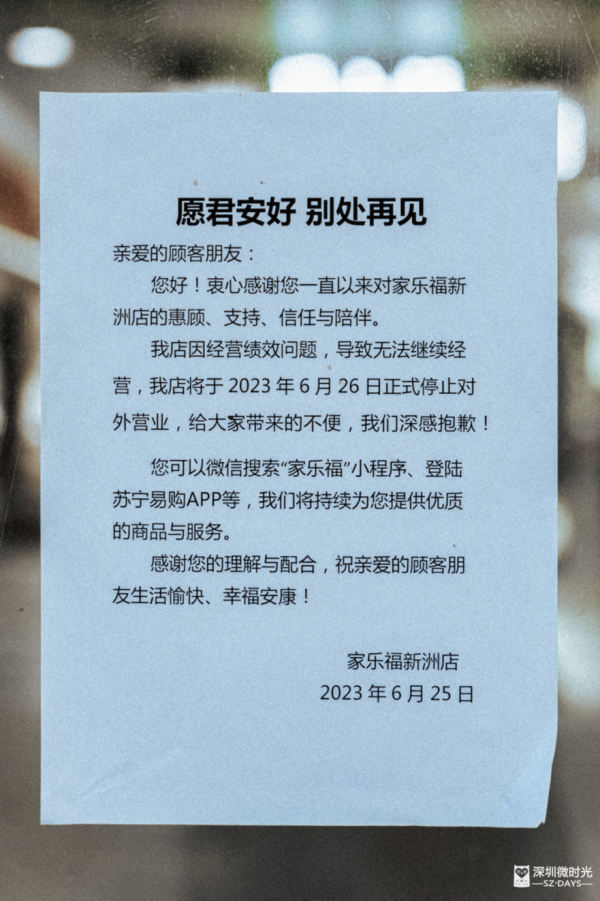 近日商業(yè)報(bào)道,深圳家樂(lè)福所有門店,已于一年內(nèi)全部關(guān)停。一句“愿君安好,別處再見”,活躍了27年之久的超市頂流,終將成為深圳人的回憶。