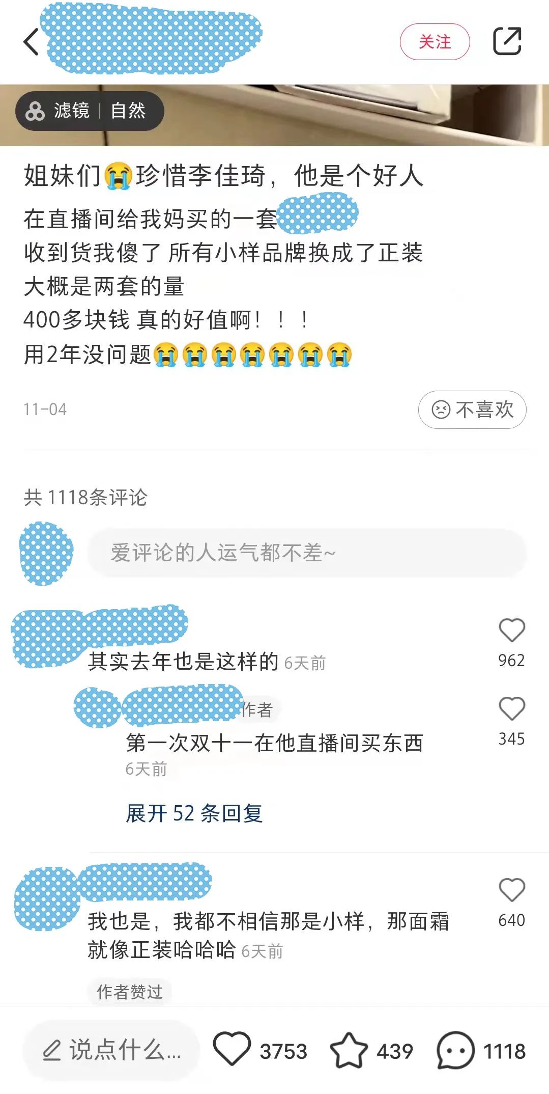 在某平臺(tái)上,顧客曬出在李佳琦直播間購(gòu)買商品,小樣全部換成了正裝。有評(píng)論表示,李佳琦團(tuán)隊(duì)會(huì)經(jīng)常和品牌方交涉這樣的事情,為粉絲爭(zhēng)取福利。