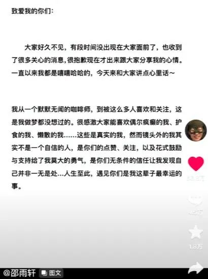 邵雨軒素面朝天地出鏡,用最自然的姿態(tài)呈現(xiàn)于人前。既沒有高高在上的感覺,又通過各種自嘲和搞笑,打造輕松的氛圍。