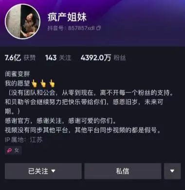 “瘋產(chǎn)姐妹”的抖音粉絲曾突破4400萬,截止宣布解散,也維持著近4400萬的粉絲數(shù)量。